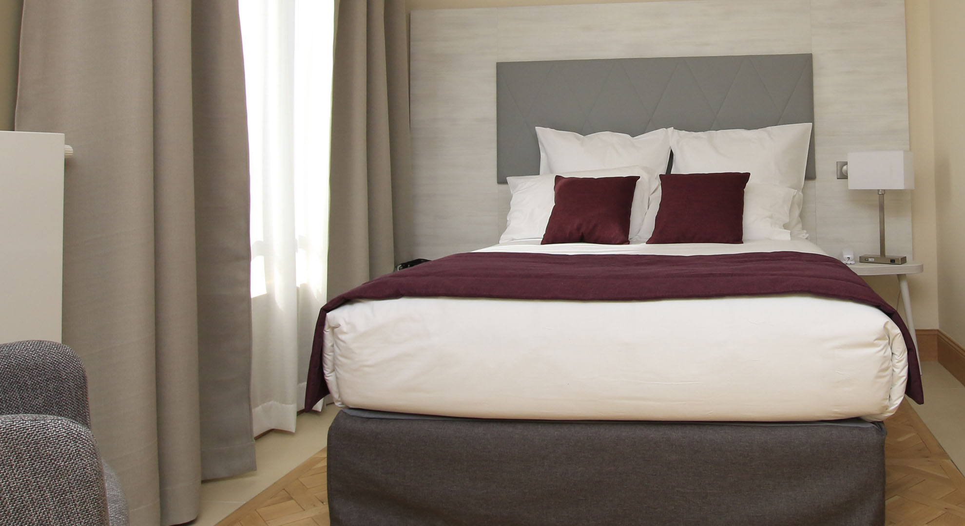 ALBA a réalisé l’ensemble des rideaux avec des textiles non feu occultants de grande qualité. Les voilages blancs permettent de tamiser la lumière tout en préservant l’intimité des chambres.